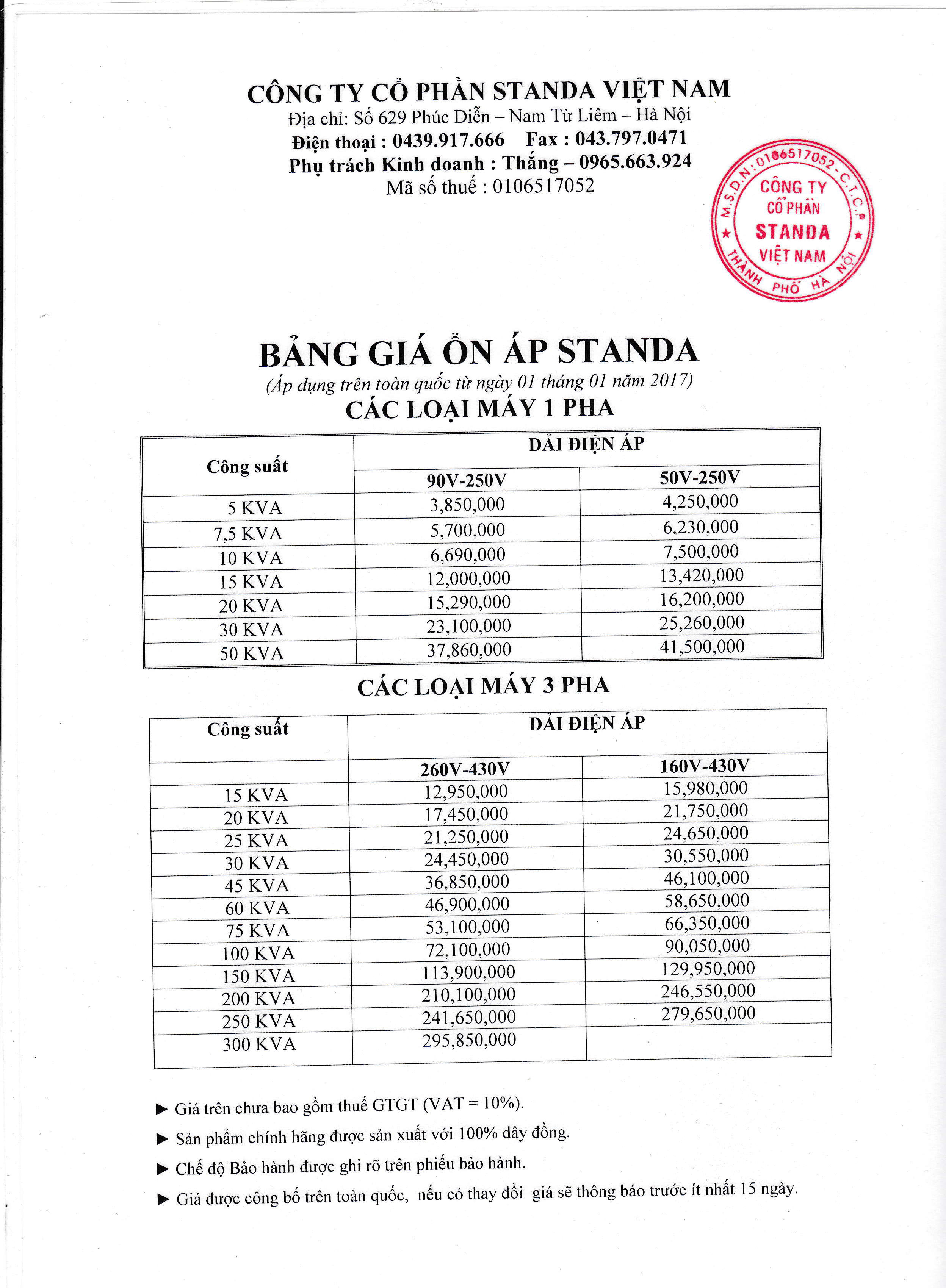 BẢNG BÁO GIÁ MÁY ỔN ÁP STANDA CHÍNH HÃNG NĂM 2017