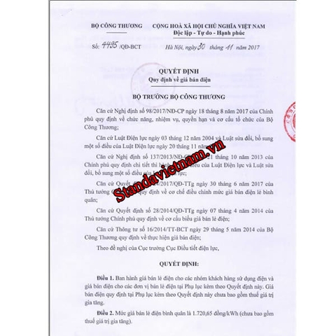 Quyết định của bộ trưởng bộ công thương về việc tăng giá điện 2017