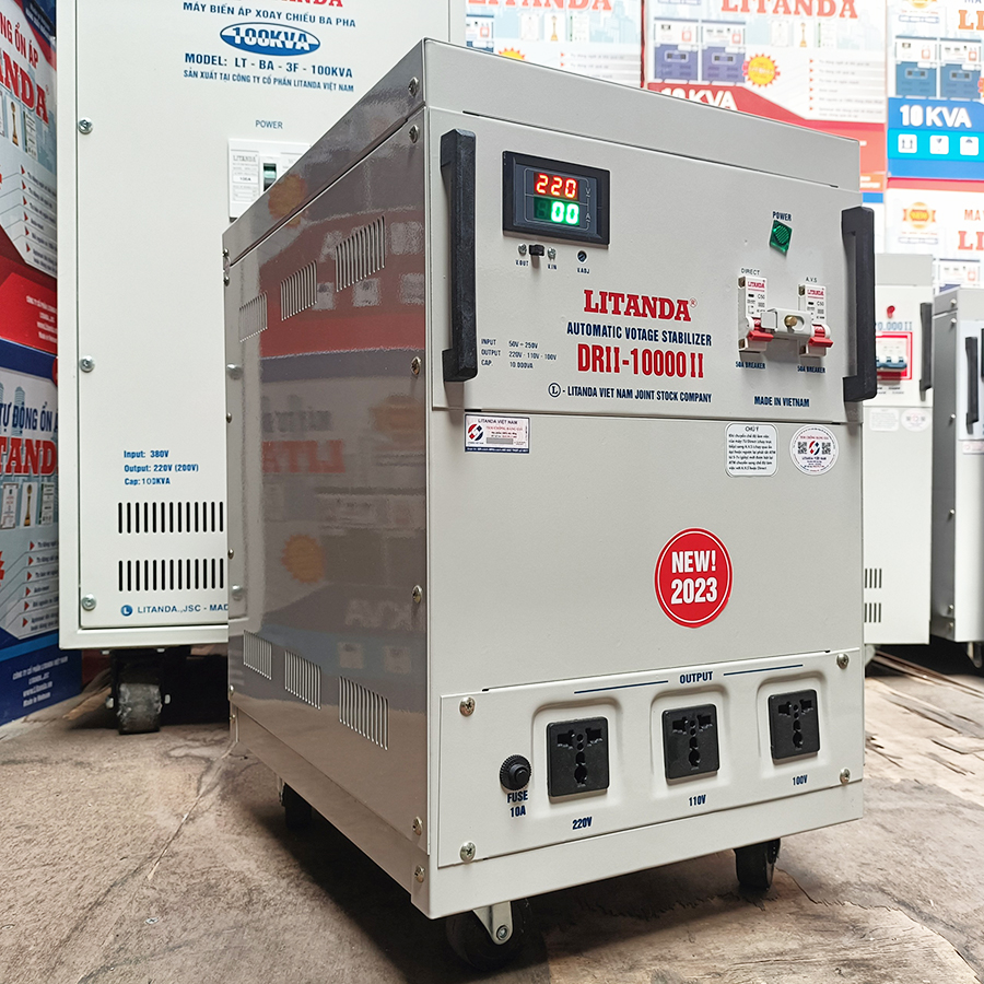 Máy ổn áp Lioa Litanda 10KVA đời mới model DRII-10000 II dải 50V-250V NEW 2023 là dòng sản phẩm có nhiều cải tiến đặc biệt. Máy được thiết kế vỏ trăng tinh tế hiện đại. Kết hợp đồng hồ hiển thị Led digital meter và aptomat đảo chiều 2 chức năng ổn áp và trực tiếp. Ngoài ra máy còn tích hợp quạt làm mát bằng không khí cho hiệu suất cao và liên tục.