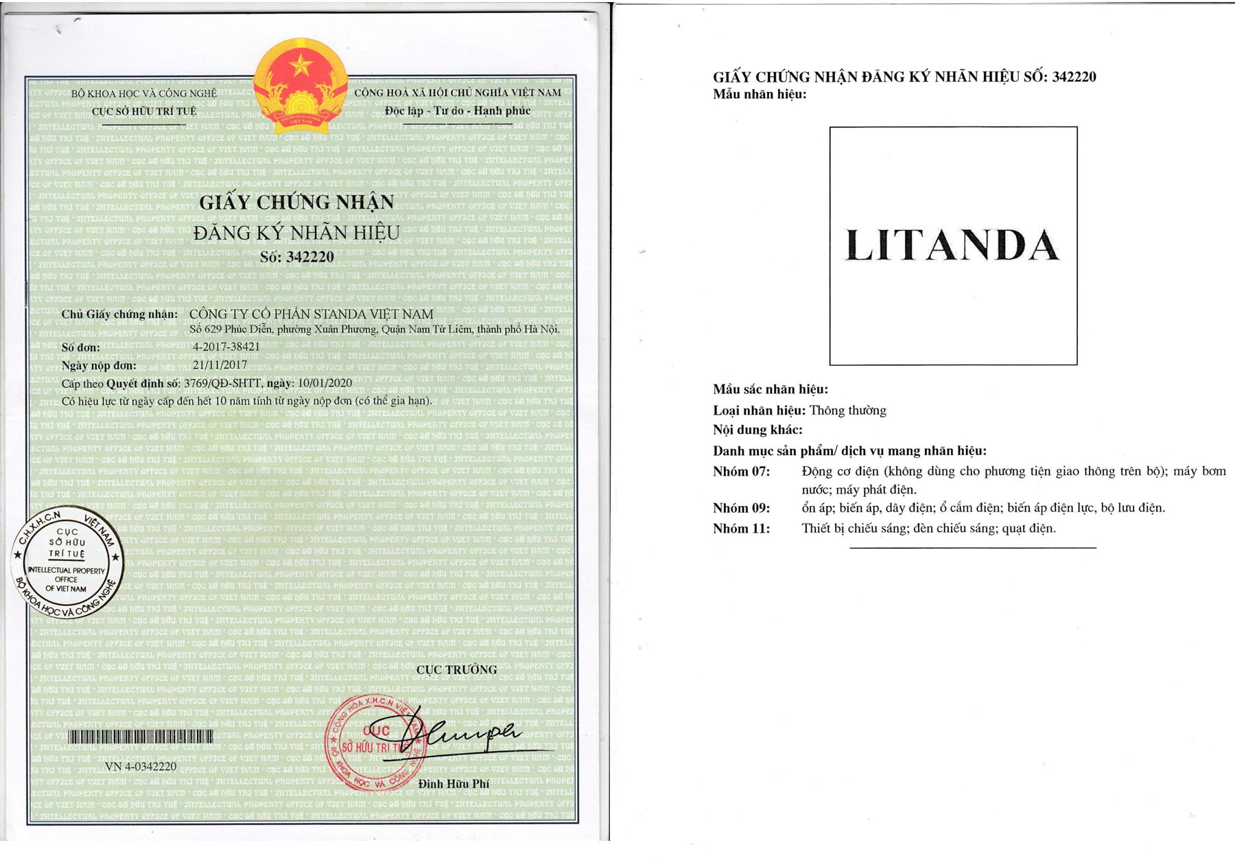 Công ty sản xuất ổn áp đã tiến hành đăng ký bảo hộ thương hiệu “LITANDA” và nhận được sự cấp phép, chứng nhận từ Bộ KHCN. Điều này giúp đảm bảo rằng chỉ có sản phẩm do công ty Litanda chính hãng sản xuất mới được phép sử dụng thương hiệu này, giúp người tiêu dùng dễ dàng nhận diện hàng thật – hàng giả khi mua hàng